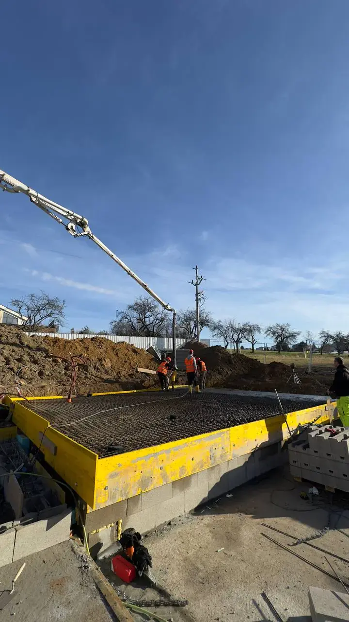 Právě probíhá betonáž základů dvojdomů A1 a A3. Po pečlivé přípravě výztuže, rozvodů inženýrských sítí a bednění přichází na řadu samotné zalití betonem.